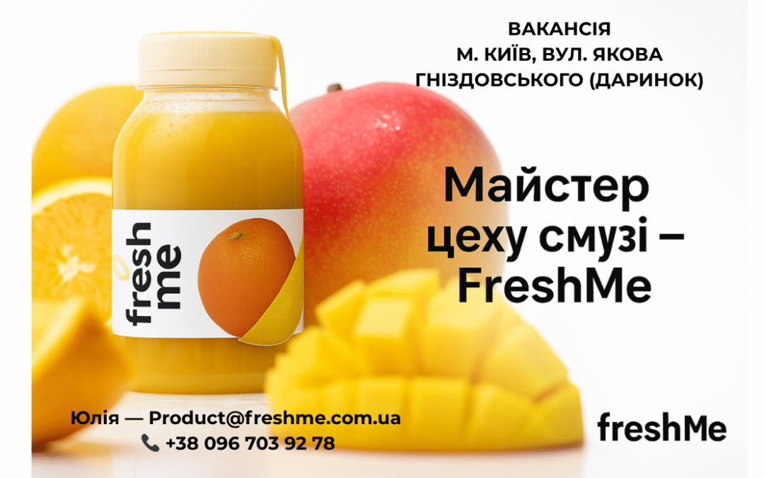 Компанія FreshMe — український виробник натуральних смузі та соків, що представлені у торговельних мережах по всій країні, шукає майстра цеху для посилення команди виробництва.